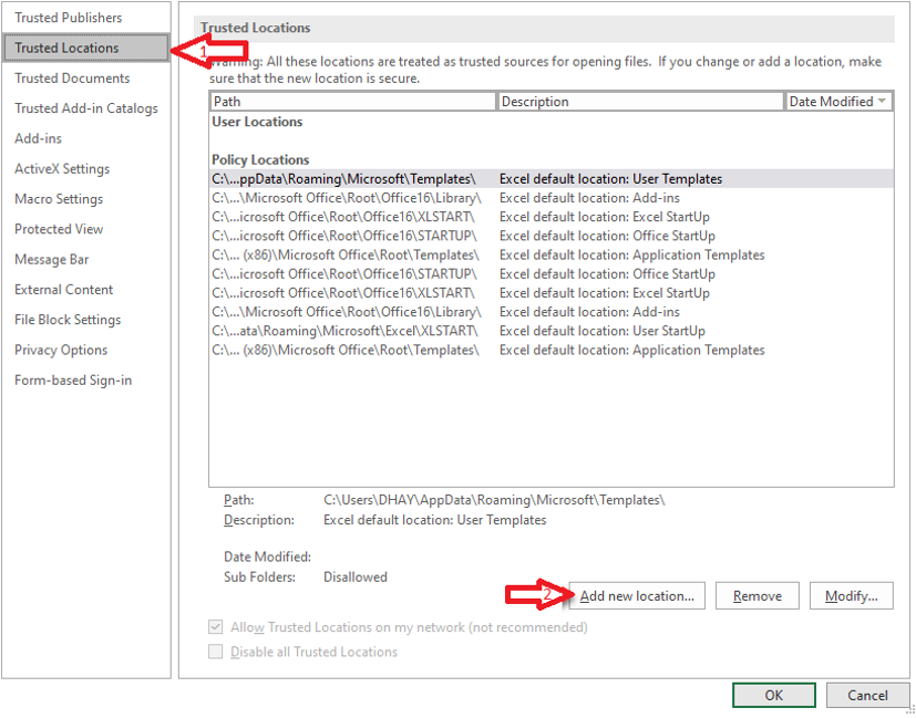 Here are the instructions on how to add a folder to the Trusted Locations list in Excel: