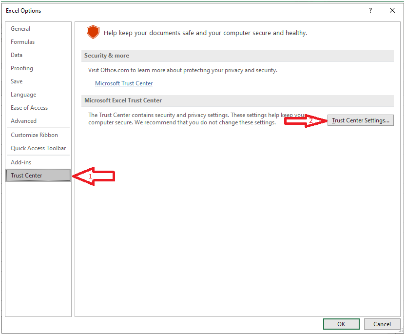 - Click Ok until you come back on the Trust Centre Window