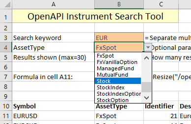 In order to update the the search results every time the search keyword is changed, we use a formula that references the input fields. An API call will automatically be executed and update the search results every time the reference cells are updated. The key to this spreadsheet is the formula in cell A11, which is displayed below. It takes the keyword from cell B3, the AssetType variable from B4, the amount of results to return from B5, and pulls the data fields specified in range A10-F10 using the TEXTJOIN function. The field names in row 10 can be adjusted to pull out different data, such as PrimaryListing (useful for Stock and CFD traders). This way, the search is entirely customizable.