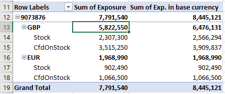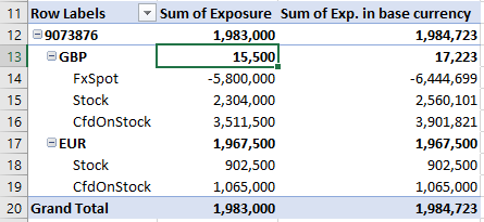 With the above VBA implemented, we now have a single button that updates the exposure data and refreshes the pivot table. Using the above example as a starting point, we can rearrange the pivot table to identify a net GBP position of almost 6 million: