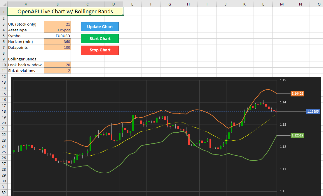 This chart features Bollinger Bands, which are fairly simple to recalculate. However, consider a situation where historic chart data is fed into many individual indicators, each of which require numerous components to be calculated separately. Assuming the chart pulls out a maximum of 1200 datapoints, a total of roughly 6000 cells are updated each time only to refresh the underlying data. Depending on the amount of calculations linked to this data, a simple refresh can quickly cascade into a series of updates across many more cells (easily over 20000). This puts serious pressure on Excel, especially considering we would ideally like to update our chart every 3 seconds. In addition, the vast majority of the recalculations is not required, as the historic data does not change (and therefore, any indicators linked to this do not change either). In essence, we are only interested in updating the most recently available value and compute the changes in the indicator values accordingly.