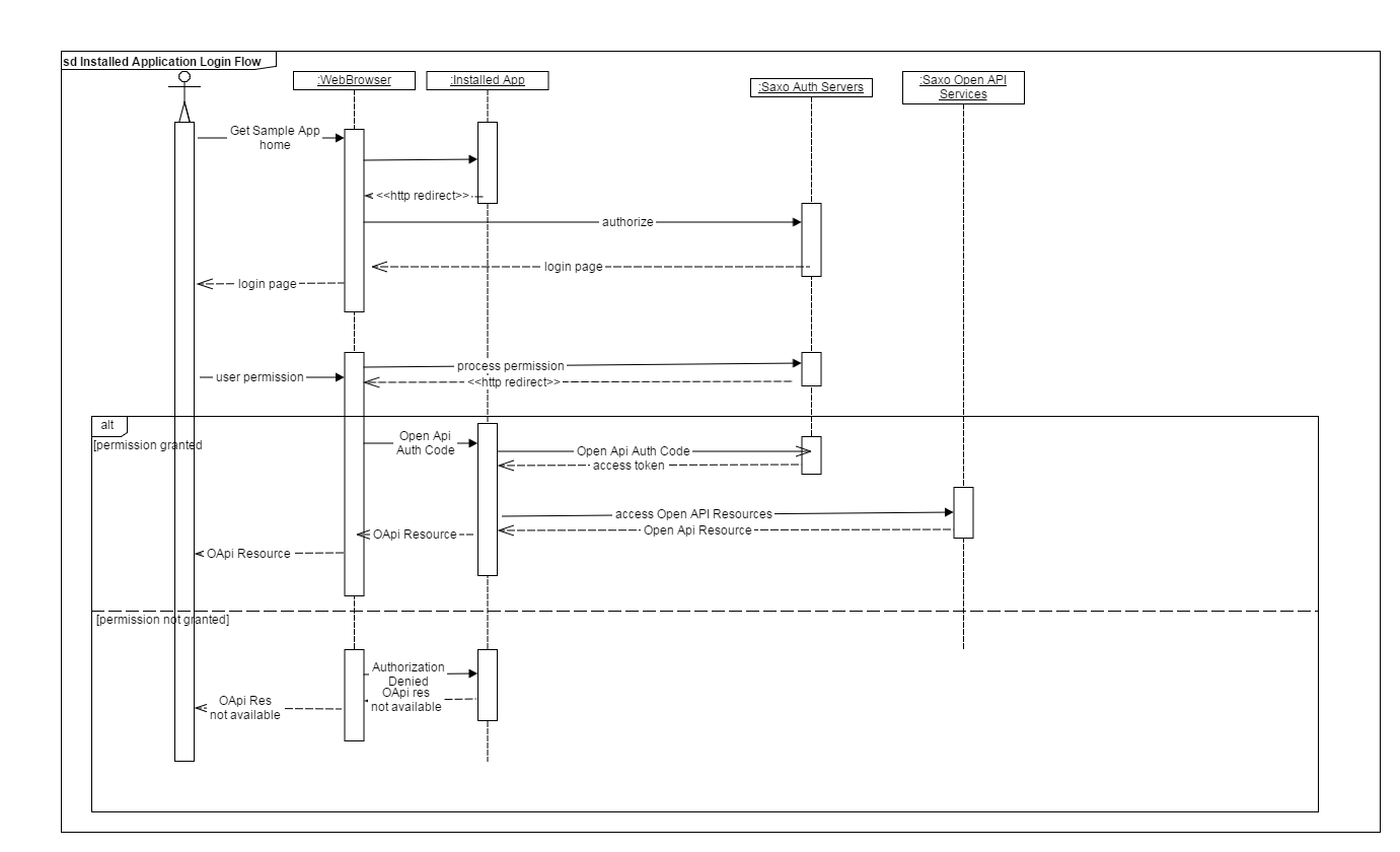 As shown in the sequence diagram above, the application flow is very similar to the Web Server application login flow. The only difference here is it assumes that the application has access to a system browser, or has a browser embedded as a web view. Installed application can keep client secret and key in the application code or can talk to a back end Server application for getting the access token. In case the application is storing the application secret and key in application code then its the responsibility of the application to take proper measure to ensure that nobody can spoof the app secret and key.