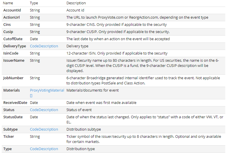 | ActionUrl | If available this URL points to a website provided by Broadridge. Navigating to this link will authenticate the client and display a user interface, through which the client can vote. The URL will only be present if the the partner has arranged for the client to subscribe to the voting service, see below. | ||||||||||||