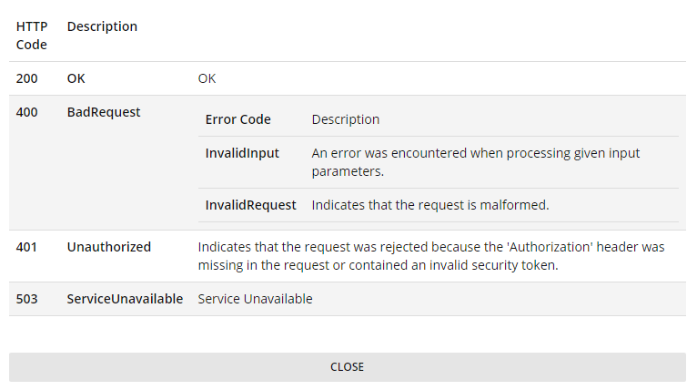 To learn about possible response and error codes returned by the endpoint click on the "View response code" link under "Response Parameters" section.