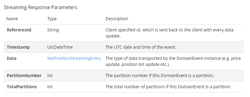 For streaming endpoints, the streaming response information and sample streaming data in JSON format is also shown under Response Example.